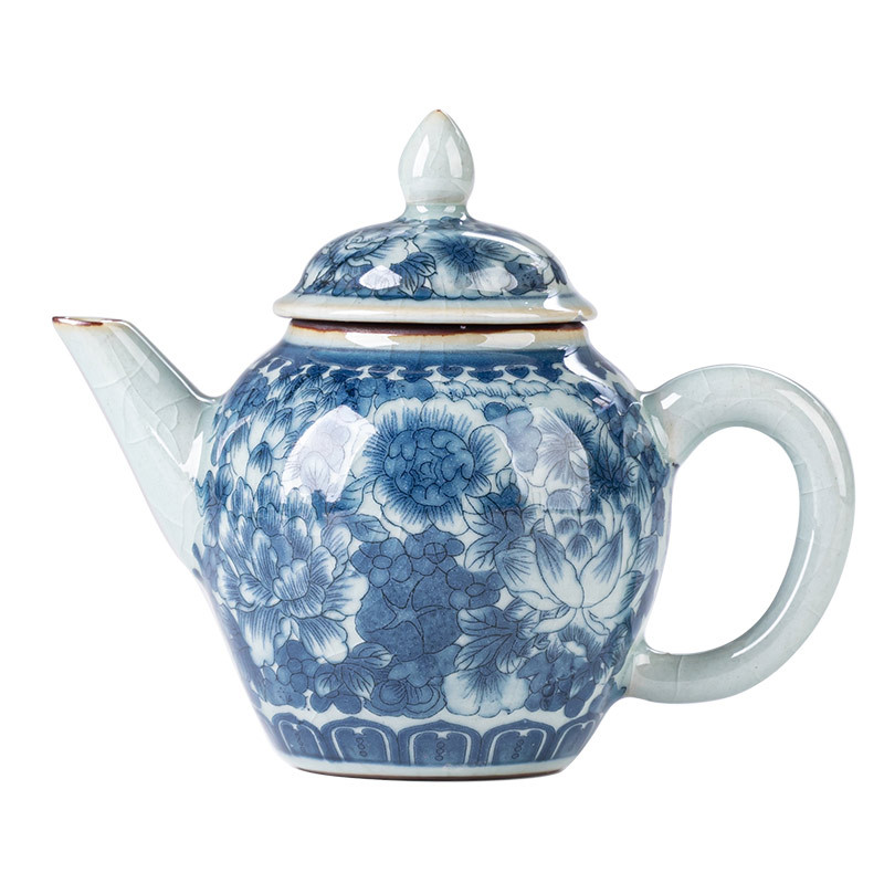 There’s something quietly captivating about this teapot. The hand-painted blue and white peony and lotus scrolls wrap around the body—symbols of prosperity and good fortune. Made from natural mineral clay and fired at high temperature, the glaze has a warm, oily luster that only improves with age.\n\nWhat makes each piece truly unique is the natural crackle pattern. During firing, the clay and glaze interact to form fine ice-crack lines—no two pots are exactly alike. Over time, as you brew tea, these cracks will gently take on a golden hue, a process cherished by tea lovers who enjoy watching their pot evolve.\n\nWith a capacity of about 170ml, this pot is perfect for solo sessions or sharing tea with a friend. The spout is well-crafted for a smooth, drip-free pour, and the handle stays comfortable to hold even with hot water inside. It handles a wide range of teas—pu’er, oolong, aged white tea—with ease, preserving aroma and adding a gentle roundness to the brew.\n\nEqual parts functional tool and quiet companion for your tea table, it’s the kind of piece that feels just right, day after day.