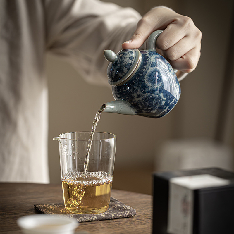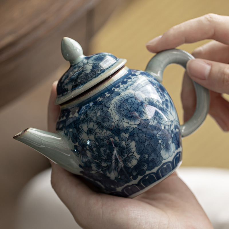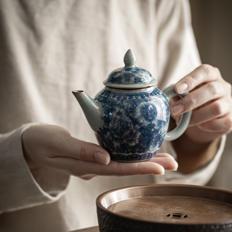 There’s something quietly captivating about this teapot. The hand-painted blue and white peony and lotus scrolls wrap around the body—symbols of prosperity and good fortune. Made from natural mineral clay and fired at high temperature, the glaze has a warm, oily luster that only improves with age.\n\nWhat makes each piece truly unique is the natural crackle pattern. During firing, the clay and glaze interact to form fine ice-crack lines—no two pots are exactly alike. Over time, as you brew tea, these cracks will gently take on a golden hue, a process cherished by tea lovers who enjoy watching their pot evolve.\n\nWith a capacity of about 170ml, this pot is perfect for solo sessions or sharing tea with a friend. The spout is well-crafted for a smooth, drip-free pour, and the handle stays comfortable to hold even with hot water inside. It handles a wide range of teas—pu’er, oolong, aged white tea—with ease, preserving aroma and adding a gentle roundness to the brew.\n\nEqual parts functional tool and quiet companion for your tea table, it’s the kind of piece that feels just right, day after day.